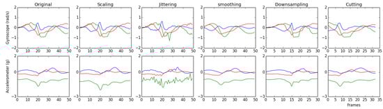 Synthetic data. Top images show gyroscope data while bottom show accelerometer data. From left to right: original signals, synthetic data modifying magnitude of signals (scaling, jittering, and smoothing), and synthetic data modifying frequency of signals (downsampling, and cutting).