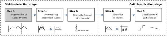The adapted method for classifying gait activities is presented in Figure 3 and detailed below. The method was divided into two stages: (i) steps detection, and (ii) gait classification. The main difference from the original method was that the segmentation was already provided in the dataset, so the input data were the segmented steps. When sensors are placed on people’s limbs, it was possible to characterize the strides, or gait cycles, of such a limb. In the dataset considered, the sensor was placed on the torso, making it possible to extract steps. The difference between stride and step was that the former comprised successive contact phases ending by the same foot, while the latter was successive contact phases of opposite feet. Despite this, the proposed method can be used under such circumstances.