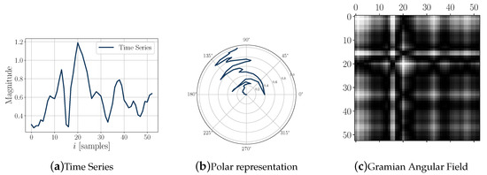 CNN is able to successfully capture the spatial and temporal dependencies in an image through the application of relevant filters. As a first step, the time series is encoded as a Gramian Angular Field (GAF) image (the encoding strategy is based on the work presented in [37]). According to this strategy, to make a GAF matrix, the values of the time series are first scaled into values between [−1,1] by using Equation (1).