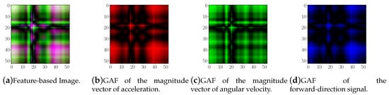 In Figure 5 an example of a feature-based image (Figure 5a), as well as its channels (Figure 5b–d) are shown. In this figure each channel is presented according to its corresponding value, for instance, the GAF image of the magnitude vector of acceleration corresponds to the red channel, then, each intensity value of each pixel in the image has a value between 0 and 255, which is shown as a red intensity value.