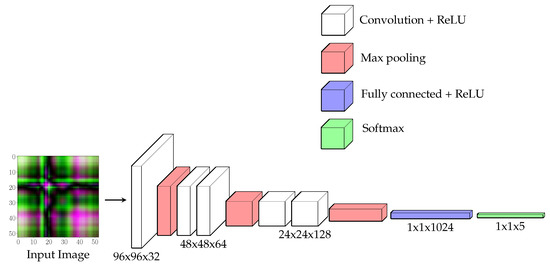 The proposed CNN (see Figure 6) is made up of five convolution layers, three max-pooling layers and two fully connected layers. Convolution layers extract features from the input image, preserving relations between pixels; besides, each convolutional layer is followed by a non-linear activation function. The most common choices of activation functions are (i) sigmoid (or logistic), (ii) hyperbolic tangent (tanh), and (iii) a rectified linear (ReLU), defined as simply to ensure that feature maps are always positive. The proposed CNN model uses ReLU, since, as shown in [38], it speeds up the training and sometimes produces more accurate results. Pooling layers are used not only to reduce the number of parameters but also to control overfitting. In particular, a max-pooling operation with a kernel was implemented in this work.