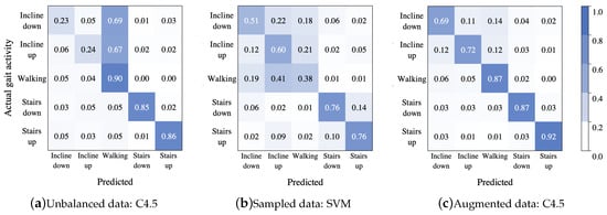Finally, the best model for each data treatment was selected for comparing the inter-activity misclassification: (i) C4.5 built with features (unbalanced data), (ii) SVM built with all features (sampled data), and (iii) C4.5 with all features (augmented data). Thus, to summarize the classification performance, a confusion matrix for each data treatment, was calculated. Figure 7 shows the confusion matrices from these classifiers, respectively. As it can be seen, the model in Figure 7a was overfitted to the majority class, because most instances of going down and going up an incline were misclassified as walking on the level ground, while the stairs activities presented the best proportion among sensitivity and specificity. In the second confusion matrix Figure 7b, there was a high confusion between the first three activities, and most instances of walking on the level ground were misclassified as going up an incline; in this case the stair activities presented confusion between them. The best classification is shown in Figure 7c, although it presented a minimum confusion in the first three activities.