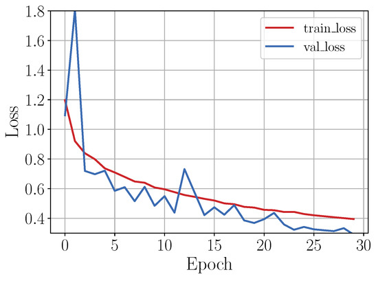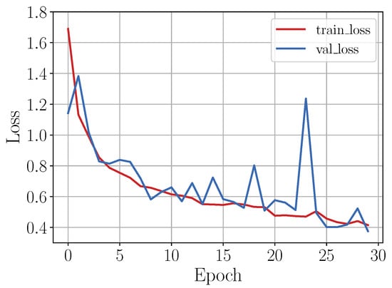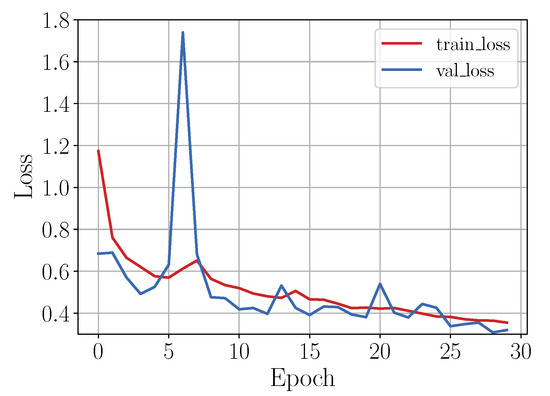 Figure 9 shows the loss curve during the training process. As in the previous case, the validation loss curve, as well as the loss curve, showed an exponential shape besides staying close, indicating that the model had a good learning rate.
