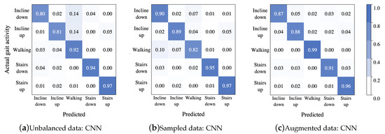 Table 10 shows that the CNN model performed well regardless of the dataset used for training. Nevertheless, the best results were presented when the augmented dataset was used, which was expected due to the considerably greater amount of data, compared to the other datasets, used in the training process. However, the amount of time to train the CNN model was also considerably greater (about 30 h on a standard laptop with an Intel Core i5 processor and 16 GB of RAM). In contrast, the lowest performance was presented when the CNN model was trained with the unbalanced dataset, except for the walking class which had around of the total number of instances of the entire unbalanced dataset.