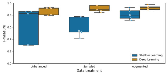 The improvement of the deep learning approach with respect to the shallow learning based approach can be seen in Figure 12. This figure shows the F-score obtained by the best classifiers of the two approaches, using the three data treatments: unbalanced, sampled, and augmented. The classifiers selected from the shallow learning approach are described in Figure 7, while those based on deep learning were presented in Table 10 and are shown in Figure 11.
