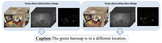 There have been significant improvements in artificial intelligence (AI) technologies for human–robot interaction (HRI) applications. For example, modern intelligent assistants (e.g., Google Assistant [1]) enable the control of household appliances through speech and allow remote home monitoring. HRI experiences can be improved through the use of AI technologies, such as the semantic and geometric understanding of 3D surroundings [2,3,4,5], the recognition of human gestures [6,7], actions [8,9], emotions [10,11], speech recognition [12,13], and dialog management [14,15]. A fundamental problem in indoor scene understanding is that scenes often change due to human activities, such as the rearranging of furniture and cleaning. Therefore, understanding indoor scene changes is essential for many HRI applications.