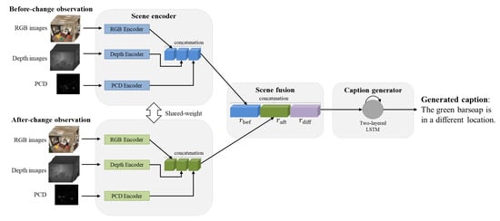 As shown in Figure 2, our framework generates a change caption from the input of observations taken before and after a scene change. A scene observation consists of RGB and depth images observed from multiple viewpoints and PCD.