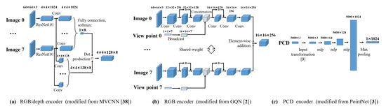 The scene encoder component transforms an observation of a scene consisting of multiview RGB, depth images, and PCD into a feature vector to express semantic and geometric information for the scene. As shown in Figure 2, we first extract feature vectors from multiview RGB images, multiview depth images, and PCD separately with respective encoders. Then, the information is aggregated via a concatenation operation. We experimented with two encoder structures, namely, MVCNN and GQN, for encoding multiview RGB images and MVCNN for depth images.