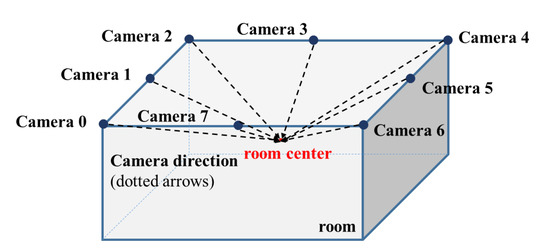 Virtual camera set-ups. Eight virtual cameras (four corners and four centers of edges of the ceiling) are set to look at the center of the room.