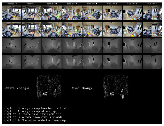 Several recent works have discussed captioning based on images that include scene changes [33,34,35]. Difference Description with Latent Alignment (DDLA) [33] generates change descriptions from two video frames observed from different time steps of a given scene. In DDLA, an image indicating the pixel-level difference between input frames is computed and a CNN is used for generating captions from this difference image. The DUal Dynamic Attention model (DUDA) [34] uses a dual attention structure for focusing regions of images before and after a change and a dynamic attention structure, which dynamically selects information from image features before or after a change, or the difference between them. DUDA is more robust to camera transformation compared to DDLA. However, both DDLA and DUDA neglect the 3D geometry information of scenes and thus are less suitable for scenes with occlusions. Qiu et al. [35] proposed a method that generates a compact scene representation from multiview images and then generates captions based on the scene representation. However, they performed experiments using scenes with solid colored backgrounds, and only considered RGB images from a fixed number of cameras.