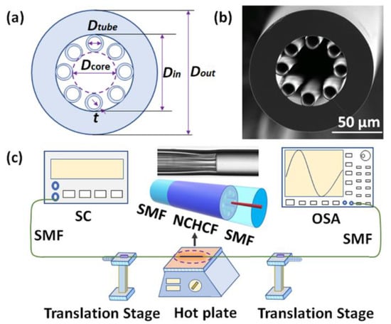 Figure 1c illustrates a schematic diagram of the experimental setup for temperature and strain measurements. The NCHCF-based modal interferometer was fabricated by fusion splicing a short section of NCHCF between two SMFs using a Fujikura 62S+ fusion splicer (Fujikura (China) Co., Ltd., Shanghai, China). The splicing parameters were carefully chosen to obtain a good transmission spectrum with low loss, high visibility and good reproducibility. The arc power was set to STD-75 bit, the arc time was 1 s. A microscope image of the splice is shown in the inset figure, as an example. It is found that the thin silica tubes in NCHCF were collapsed slightly close to the splice point. Then, two ends of the SMFs were fixed on two manual translation stages to realize strain measurement. A temperature test was carried out by placing the sensor structure on a controllable hot plate. Light from a broadband supercontinuum source (SC, SC-YSL, YSL Photonics, Wuhan, China) was launched into the NCHCF based structure and the transmitted light was interrogated by an optical spectrum analyzer (OSA, Yokogawa AQ6370D, YOKOGAWA, Tokyo, Japan). The NCHCF structure was connected to the SC and OSA through SMFs.
