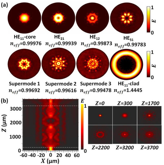 (a) Examples of different mode profiles (normalized) within the NCHCF, and their corresponding effective refractive indices, simulated by an finite-element method (FEM).; (b) Energy distributions in the XZ plane along the SMF-NCHCF-SMF length (lengths of the input and output SMF, and NCHCF are 200 μm, 500 μm and 3000 μm, respectively) and the mode profile evolution at the cross-section at different fiber structure lengths, simulated by a beam propagation method (BPM).