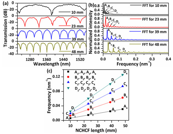 In order to gain a better understanding of the impact of the length of the NCHCF section, prior to performing the temperature and strain tests, the transmission spectral responses in air of the proposed sensor structures with different lengths of the NCHCF were firstly measured and analyzed, and some of the examples are illustrated in Figure 3a. Series of periodic transmission dips with large extinction ratios (up to ~30 dB) and wide FSR have been observed for all samples over a wide wavelength range from 1220 nm to 1550 nm. The FSR is much bigger than previous reported PCFs based interferometers with the same sensor lengths [7,23,24]. As the length of the NCHCF increases from ~10 mm to ~48 mm, the measured spectral FSR decreases. This is a typical feature of such interferometers, agreeing well with Equation (5). The insertion loss of the structure is approximately 3.5 dB, and no obvious changes in the insertion loss are observed with the increase in the NCHCF length, demonstrating its much lower transmission loss than that of an annular capillary fiber (hollow core fiber) as reported in our previous work [25]. It is well known, that large FSR and low transmission loss enable a wide measurement range and the possibility of cascading of more fiber sensors within a single system, while high extinction ratio dips can facilitate higher sensitivity in case of intensity demodulation, and higher spectral resolution in case of demodulation in the wavelength domain, hence the NCHCF structure shows promising sensing applications. Figure 3b shows the fast Fourier transform (FFT) spatial frequency spectra corresponding to the measured transmission spectra in Figure 3a. Several spatial frequency peaks are observed, which confirms that multiple modes are involved in the interference fringe patterns. Four main peaks in each of the spatial frequency spectra for the different sensor lengths are labeled as A1, A2, A3, A4, B1, B2, B3, B4, C1, C2, C3, C4, D1, D2, D3, D4, respectively. The relationship between the spatial frequencies (corresponding to the above frequency peaks) and the sensor length is plotted in Figure 3c. In the figure, the straight lines are the linear fittings for the data obtained from Figure 3b. As one can see from the figure, the spatial frequency increases linearly with the sensor length, indicating that interferences in samples with different sensor lengths are created by the same modes. The result agrees well with the theoretical prediction, where the spatial frequency (ξ) can be expressed as [26]:
