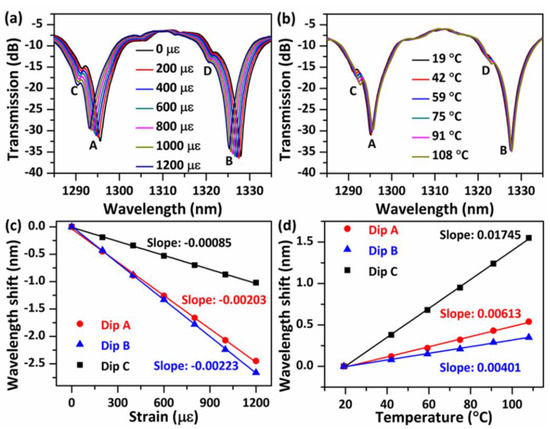 A sensor sample with a NCHCF length of ~48 mm (denoted as S-48) is chosen for the experimental demonstration of its sensing properties for strain and temperature. The sample with a longer length of NCHCF is used because it possesses a higher quality (Q, defined as the ratio of a dip’s central wavelength to its full width at half-maximum bandwidth) factor and a “cleaner (smoother)” spectrum, and hence gives a more accurate test result and the potential for a higher sensitivity in an actual sensing system. Examples of the measured spectral responses from 1285 nm to 1335 nm under various strains and temperatures are shown in Figure 4a,b. The spectrum moves monotonically towards shorter wavelengths as the strain increases, while a red shift is observed with the increase in temperature. Three transmission dips (dips A, B, and C) with relatively large strengths were employed to calculate their wavelength shifts versus strain and temperature, the corresponding results are presented in Figure 4c,d. In our experiment, a blue wavelength shift is referred to as a negative wavelength shift, while a red wavelength shift is referred to as a positive wavelength shift. The results show that, for all three selected dips, the measured wavelength shifts linearly increase with strain and temperature. The measured strain sensitivities for dips A, B and C are −2.03 pm/με, −2.23 pm/με, and −0.85 pm/με, respectively. The measured temperature sensitivities for dips A, B and C are 6.13 pm/°C, 4.01 pm/°C, and 17.45 pm/°C, respectively. The maximum temperature and stain sensitivities are better than that of a typical FBG sensor and are compatible with that of many other PCFs-based sensors and multi-parameter sensors [27,28,29,30].
