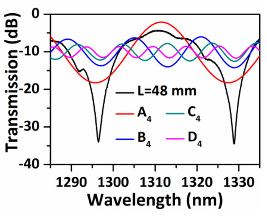 To determine the origin of the dips, the band pass filter method is applied in FFT, the transmission spectra of the sample S-48 are recovered for each corresponding frequency (A4, B4, C4, D4) as shown in Figure 5. It is evident that the spectrum corresponding to frequency A4 is the main contribution to dips A and B. It is known that ∆neff can be calculated with the following equation [31]: