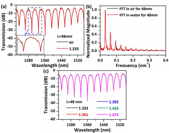 For completeness, the sensitivity of the sensor to the RI of surrounding environment was also checked. Initially, the sensor’s performance for a significant step change in the external RI was investigated as shown in Figure 6. Figure 6a compares the transmission spectra in air and water, the major dips remain almost unchanged in the presence of a step change in the RI. Further FFT analysis (Figure 6b) found that the main peaks in the spatial frequency spectra change only slightly, but some smaller peaks located at relatively high frequencies disappear and correspond to the spatial frequencies of the disappeared transmission dips in Figure 6a. This is reasonable, since modes HE11 and HE12 are well confined inside the central hollow core and they are isolated from the outer environment.