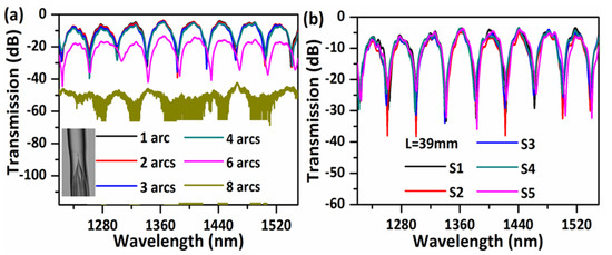 (a) Measured transmission spectra of five reproduced sensor samples with a NCHCF length of 39 mm; (b) Measured transmission spectra with different number of arcs performed on the splice point between SMF and NCHCF.