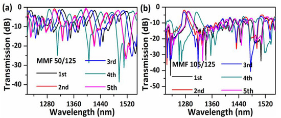 Measured transmission spectra of five sensor samples with an MMF length of ~39 mm for (a) MMF 50/125; and (b) 105/125.