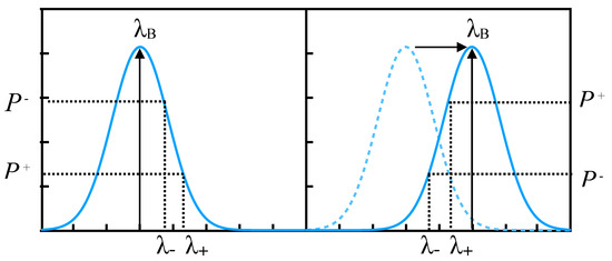 Our DWDD scheme is illustrated in Figure 1. We use measurements of the reflected power at two close wavelengths and separated by a fraction of the grating full-width at half-maximum (FWHM) . As the Bragg wavelength shifts under the influence of the measured parameter, the difference between the two reflected powers and changes. For example, as illustrated, as shifts from to with respect to the average between those two wavelengths , the difference between the two reflected powers is inverted. It is thus essentially related to the slope of the spectrum at , and is a one-to-one function of . Dividing the difference by the sum of the reflected powers normalizes the signal and makes it insensitive to the propagation loss between the source and the sensors, as well as to power fluctuations of the source. A Gaussian-shaped spectrum also results in a signal that is linear with respect to the Bragg wavelength, as was demonstrated in [10,12]. In [11], this simple algorithm was implemented in an FPGA chip, and could calculate the status of the sensor from nanosecond pulses in real time, leading to effective measurement speeds of more than 1 MHz for 15 simultaneously measured sensors.