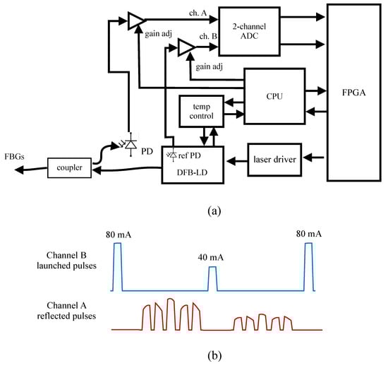 The instrument schematic is shown in Figure 3a, while Figure 3b illustrates (not actual data) the sequence of lauched pulses detected in channel B of the ADC and the received pulses from the multiple FBGs detected in channel A. A first pulse at 80 mA was launched, and time was allowed for the echoes from up to 15 sensors to be received by the photodiode and digitized by the ADC (though only 5 are shown in the Figure). A second pulse at 40 mA was then launched, and the echoes were similarly detected and digitized. The FPGA then performed calculation of the 15 DWDD signals in real time, after which another pair of pulses is launched. All the components were mounted on a PCB (designed and fabricated by IPCB Systems, Bromont, QC, Canada). A CPU controls the various components, and communicates with a computer via a USB link, where the acquisition parameters can be selected from a user interface.