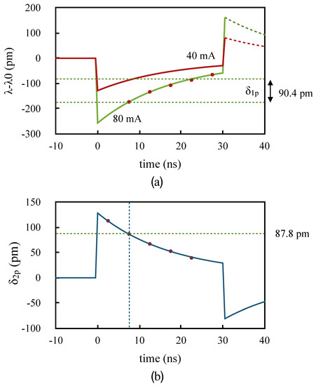 According to the model of Equation (4), as the current rapidly rises, the wavelength drops simultaneously. Following this fast drop, the wavelength then rises with an experimentally determined time constant of 17.8 ns. After the end of the pulse, the wavelength rises rapidly because the adiabatic contribution vanishes, and then decreases with the same thermal time constant as the laser junction cools down. This is however not observable because there is no more optical power being emitted, hence it is shown as a dashed line in Figure 5a.