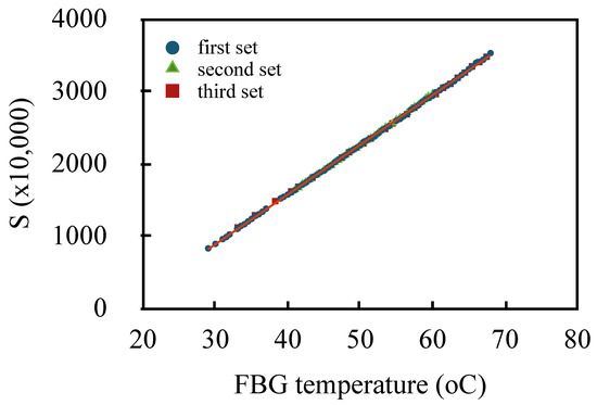 Signal S as a function of the FBG sensor temperature for three measurement sets.