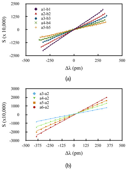 This instrument showed high performance for measuring FBGs as temperature sensors [11]. As an illustration, Figure 6 shows three sets of measurements of S as a function of temperature for FBGs immersed in water, using the two-pulse scheme with 5 ns pulses. The FBG had 710 pm bandwidth and about 1.5% reflectivity. Over the temperature range, the signal had extremely good linearity () and the measurements were highly repeatable. Taking into account the noise in the value of S, we estimated the effective resolution as 0.05 C. More details on the instrument performance in measuring multiple sensors will be given elsewhere.