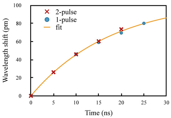 For the two-pulse scheme, the wavelength difference , and therefore the sensitivity, is higher at the beginning of the pulses, as can be deduced from Figure 5b. Therefore, maximum sensitivity is obtained for shorter pulses. For the one-pulse scheme, we found that the wavelength difference when using samples at t and ns, is nearly the same as obtained using the samples at time t in the 40 mA and 80 mA pulses. This is illustrated by the dashed lines in Figure 5b, which show the value of for a sample taken 7.5 ns from the start of the pulse (87.8 pm), and in Figure 5a, which show the value of from the difference in wavelength between a sample taken 15 ns later than the 7.5 ns sample (90.4 pm).