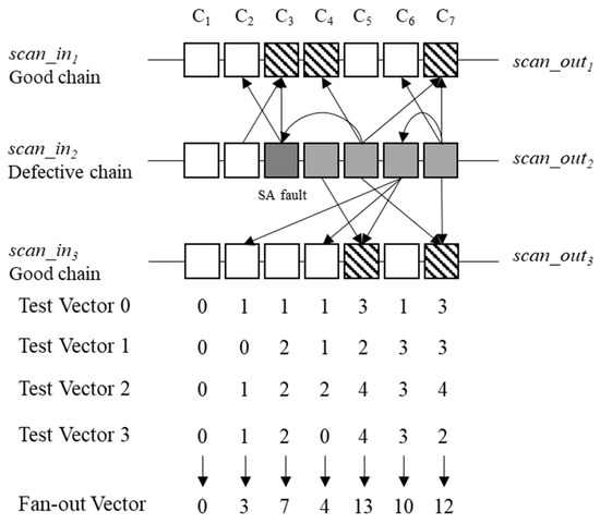 An example of the fan-in filters is demonstrated in Figure 6 and Table 1. The target circuit comprises three scan chains, each containing seven cells. For ease of explanation, Cell B in Chain A is referred to as SACB. If an SA0 fault occurs at Cell 5 in scan chain 2 (S2C5), then errors occur at Cells 1, 2, and 6 in scan chain 1 (S1C1, S1C2, S1C6), Cells 1–5 in scan chain 2 (S2C1, S2C2, S2C3, S2C4, S2C5), and Cells 1, 2, and 6 in scan chain 3 (S3C1, S3C2, S3C6) in the observed responses of test pattern 0.