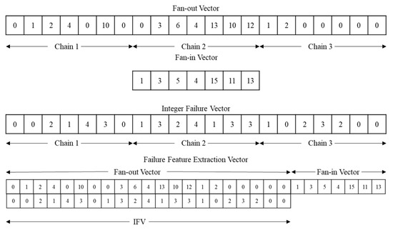 The input vector of the proposed methodology, which is called the failure feature vector, is formed by combining three vectors. The first vector is the fan-in vector from the fan-in filter, the second vector is the fan-out vector from the fan-out filter, and the last vector is the IFV. These failure feature vectors are generated from the failure log datasets using the fan-in and fan-out filters. Furthermore, the generated failure feature vectors are categorized into train and test sets for training and testing, respectively. An example of the training vector is illustrated in Figure 8.