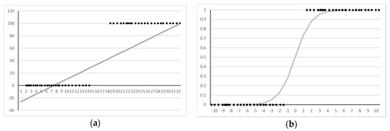 Pass/fail class with linear regression (a) and logistic regression (b).