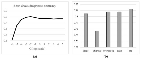Figure 10 shows the accuracy of scan-chain diagnosis depending on the inverse of the regularization strength with the lbfgs solver. Moreover, the inverse of the regularization strength was changed to a logarithmic scale (i.e., 0.01, 0.1, 1, 10, 102 …). The accuracy increases as the inverse of the regularization strength increases from to . Subsequently, the accuracy gradually decreases as the inverse of the regularization strength increases. Therefore, the accuracy of scan-chain diagnosis is the highest when the inverse of regularization strength is . Figure 10a demonstrates the impact of the inverse of the regularization strength on the accuracy.