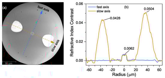The corresponding refractive index profile of this fiber was measured by an IFA-100 Fibre Index Profiler and then plotted in Figure 1b. The core has a quasi-step-index profile and the maximum refractive index difference from that of pure silica is around 0.0062. The refractive indices of two SAL rods show parabolic-like distribution and the maximum values are about 0.0428 and 0.0504, respectively. Contrary to conventional PANDA PMFs whose stress rods are made of borosilicate, in our fiber, the refractive indices of SAPs are higher than that of the fiber core since the dopant (La2O3) has much higher refractive index than pure silica []. Referring to conventional PANDA PMFs, the axis parallel to the applied-stress direction is defined as “slow axis”, whereas the perpendicular axis is defined as “fast axis” [].