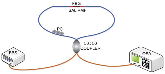The Bragg grating in this SAL PMF was fabricated by using conventional ultraviolet (UV) laser lateral exposure method, in which the fiber was exposed to the interference fringe by scanning a phase mask with a UV laser []. Before being exposed to UV light, the photosensitivity of SAL PMF was enhanced via hydrogen loading process at 12 Mpa and 80 °C for one week. Next, a 56-mm-long SAL PMF was spliced with two single-mode fibers and then connected to a broadband source (BBS, Infinon Research Broadband Source) and an optical spectrum analyzer (OSA, Yokogawa AQ6370C) through a 50:50 coupler, as shown as the schematic diagram in Figure 2. A polarization controller was inserted into the fiber loop to optimize the output interference spectrum. The UV light was generated from a frequency-doubled continuous-wave (CW) Argon laser (Coherent, INNOVA 90C) and the power was about 70 mW. The period of phase mask was 1070.20 nm, corresponding to the grating pitch of 535.10 nm. The resolution of OSA was set to 0.02 nm. Before laser scanning, an additional alignment of the refractive index axis was conducted to avoid that the core was shadowed by the stress rods. The UV laser was moved out of the mask region and focused on the SAL PMF. Since the diffraction pattern illuminated through the fast axis was significantly different from that through the slow axis, the illumination direction was aligned along the fast axis by rotating the fiber and monitoring the diffraction pattern. Finally, the Bragg grating was inscribed by moving the UV laser to scan the phase mask with the speed of 0.02 mm/s. The inscription length was 10.00 mm.