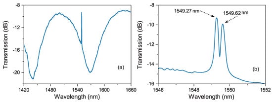After the grating inscription process finished, the transmission spectrum was measured and plotted in Figure 3. As shown, two Bragg grating peaks, corresponding to the Bragg reflections of slow-axis and fast-axis polarized modes, are embedded in the interference fringe and their central wavelengths are 1549.62 nm and 1549.27 nm, respectively. According to the phase-matching condition of fiber Bragg grating, , the effective refractive indices of slow-axis and fast-axis polarized modes ( and ) can be calculated, respectively.
