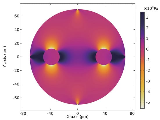 Since the birefringence in the SAL PMF is induced by the asymmetric thermal stress through elasto-optical effect, the internal thermal stress of the fiber and the consequent phase birefringence were numerically analyzed by using the solid mechanics and wave optics modules in COMSOL Multiphysics [,]. The detailed parameters of the fiber’s structure and materials are listed in Table 1. In order to simplify the simulation model, the fiber’s structure was defined to be axial symmetric along the fast and slow axes. Moreover, the core, SAL rods and outer cladding were all drawn by perfectly circular shape, and they were of 8.4 μm, 24.2 μm and 140 μm in diameter, respectively. A step-index profile of the refractive index was adopted. The material refractive indices of the pure silica and germania-doped silica (core region) were described by a three-term Sellmeier dispersion formula with corresponding coefficients []. The mole fraction of germania in fiber’s core can be deduced by the measured refractive index difference of the core and the relationship between the refractive index variation and the doping concentration of germania () []. Here, equals 0.0062 according to measured index contrast shown in Figure 1b. The index of SAL glass was represented by adding a fixed value to the dispersion formula of pure silica. The fixed value was the average index difference of the SAL rods compared to the pure silica cladding. It was estimated around 0.045 based on the measured index distribution. Since the doping concentration of the fiber’s core was only around 4.0 mol.%, the core was assumed to have the same Young’s modulus, Poisson’s ratio and relative density as those of pure silica, while those of SAL rods were much higher and cited from previous work []. All the materials were set with the same stress-optical coefficients.