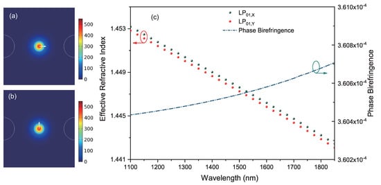 When the fiber was cooled down from 1100 °C (reference temperature) to 20 °C (operating temperature), the difference between the stress distribution along slow-axis and fast-axis directions was simulated and illustrated in Figure 4. As shown, the mean stress distributes anisotropically on the SAL PMF’s cross section, and the mean stress near the core region is around Pa. Consequently, the material refractive indices become anisotropic accordingly, resulted in the breakage of the degenerateness of fiber’s fundamental modes. Figure 5a,b show the simulated electric field distribution of x-polarized and y-polarized fundamental modes, denoted respectively with LP and LP. Their polarization states (marked with white arrows) point to the slow axis and fast axis, respectively. Their effective refractive indices decrease monotonically from wavelengths of 1100 nm to 1900 nm, while the corresponding phase birefringence increases very slightly. The simulated phase birefringence is estimated at 3.6 × for a wide wavelength range. It agrees basically with the experimental results (3.27 × ). The slight gap may be attributed to the structural mismatch between the experimental fiber and simulation model.
