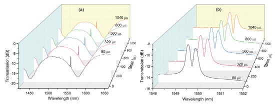 The sensing performance of the proposed device was investigated as the following. Firstly, the sensor head was clamped on two translation stages whose fine resolution was limited to 0.5 μm. One stage was fixed, whereas the other one was driven by a micrometer to stretch fiber []. When the axial strain was increased from 0 to 1200 , as shown in Figure 6a,b, both interference pattern and Bragg peaks shift to longer wavelengths. Moreover, it is worth noting that the red shift of two FBG peaks are very similar and the wavelength gap between two peaks becomes slightly larger with the increment of applied axial strain. It indicates that the phase birefringence of the SAL PMF is enlarged as the fiber is stretched increasingly. For PMF-based Sagnac interferometer, the relationship between the shift of interference wavelength ( ) and applied axial strain () can be described by , where is the strain-optic coefficient of the fiber’s birefringence. Since both physical length and birefringence depend on axial strain positively, the Sagnac interference spectrum will consequently shift to longer wavelengths.