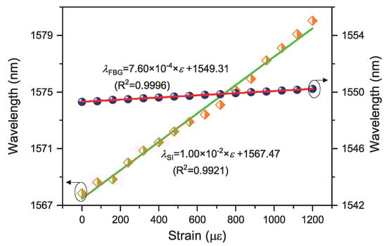By following the wavelength variations of the fast-axis Bragg peak and one interference dip, the strain sensitivities of the Bragg grating and the interference dip of the proposed device can be characterized to be 7.60 nm/ and 1.00 nm/, respectively, as shown as the linear fitting curves in Figure 7. Their corresponding R-squared factors of linear fitting are 0.9996 and 0.9921, respectively.