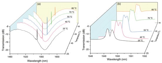 Then, the sensor head was placed into a high-accuracy column oven to characterize its thermal performance. The temperature precision of this oven is 0.1 °C. A tiny tension was applied at both ends of the sensor head to keep it straight and then the temperature was increased from 25 °C to 85 °C with the step of 5 °C. The corresponding transmission spectra of the Sagnac interference and Bragg grating were recorded and illustrated in Figure 8a,b, respectively. As shown, the interference spectrum shifts to shorter wavelengths with the increment of temperature, while the Bragg peaks shift to longer wavelengths. Moreover, the gap between two Bragg peaks decreased apparently in the process of rising temperature. It means that the phase birefringence of the SAL PMF tends downwards when fiber temperature goes upwards. Similarly, the variation of interference wavelength () is related to fiber’s thermal expansion and the birefringence change caused by thermo-optic effect, , where is the thermal expansion coefficient and is the equivalent thermo-optic coefficient of birefringence. As illustrated in Figure 8b, two FBG peaks goes closer with increasing temperature. It indicates that the difference between the effective refractive indices of two polarized modes (i.e., phase birefringence) becomes smaller and the equivalent thermo-optic coefficient of birefringence should be negative. Although is positive, the thermo-optic effect induced birefringence variation contributes dominantly to the shift of interference fringe []. Therefore, the negative response of the interference dip to temperature, shown in Figure 8a, can be well explained.