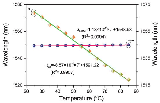 In parallel with the strain measurement, the temperature sensitivities of the fast-axis polarization Bragg peak and the interference dip are taken at 1.18 × nm/°C and −8.57 × nm/°C, respectively, as shown by the linear fitting results in Figure 9. Their corresponding R-squared factors of linear fitting are of 0.9996 and 0.9921, respectively.