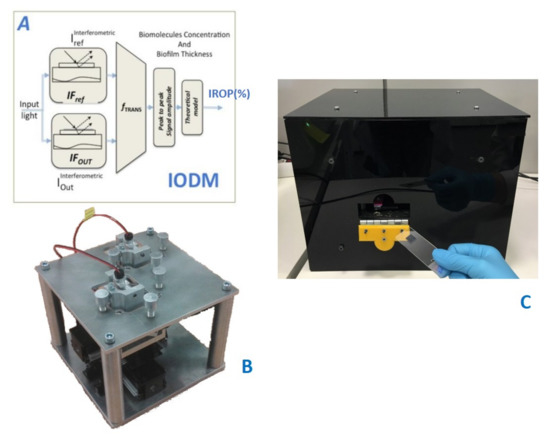 The read-out methodology for this point-of-care device is based on the increase relative optical power (IROP) value, previously introduced in several publications [27,28,30], and defined as the quotient of the optical power of two interferometers: signal (ISig) and reference (IRef) interferometers in a certain optical band, given by the light source employed (Figure 2).
