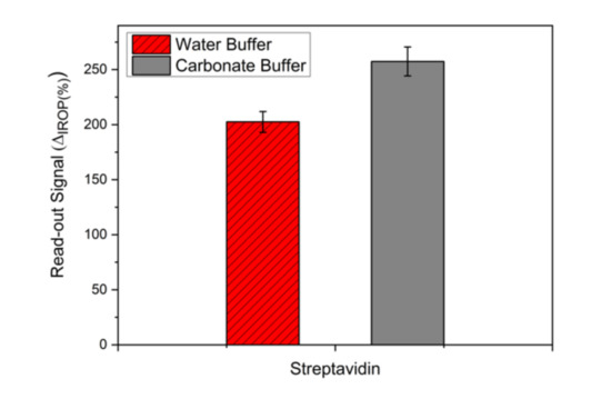 To optimize a monolayer of the streptavidin sensing surface, two buffers were evaluated. In Figure 4, we show the signal obtained for the water buffer and carbonate buffer in the same conditions. It can be seen that the signal for the carbonate buffer is higher than the deionized water buffer. To evaluate the stability of the streptavidin monolayer, we studied consecutive washing steps of 20 mL of distilled water (Figure 5). We can see that the stability of the streptavidin sensing surface immobilized with deionized water buffer is the same, but with the same washing steps, the signal with the carbonate buffer decreased very much and this means that the streptavidin layer was removed.