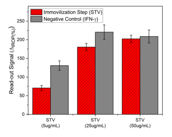 In addition, the streptavidin dose–response curve was made to ensure surface stability and specificity. This was done by incubation of 5, 25, and 50 μg/mL during 1 h of streptavidin. Then, interferon gamma was incubated at 10 μg/mL for 3 h directly over the streptavidin layer as a negative control. The results are shown in Figure 6. It can be seen that for a streptavidin immobilization concentration of 50 μg/mL, the signal when the incubation of interferon gamma is made is the same and therefore there is no recognition of interferon-gamma over streptavidin.