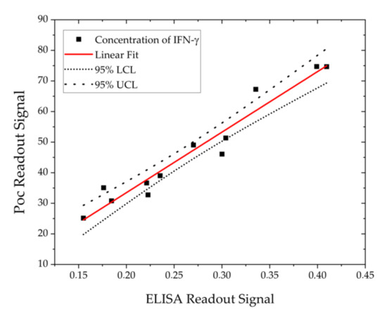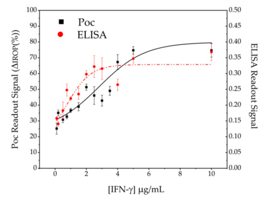 IFN-γ concentration detection. The black squares correspond to the PoC technology and the red dots to the ELISA technique.
