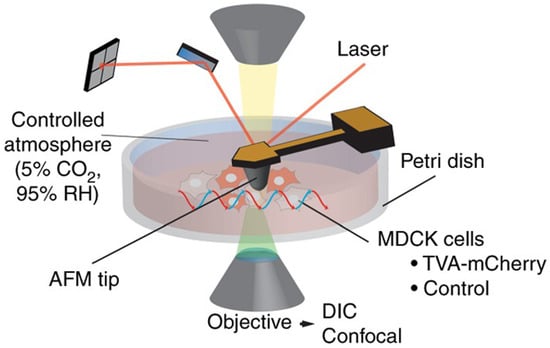 AFM provides a technology that can also be integrated with other microscopic and spectroscopic techniques such as laser scanning confocal microscopy (LSCM) [23,24], total internal reflection fluorescence microscopy (TIRFM) [25,26,27], aperture correction microscopy (ACM) [28], correlative stimulated emission depletion microscopy (STEDM) [29,30,31], fluorescence lifetime imaging microscopy (FLIM) [32,33], stochastic optical reconstruction microscopy (STORM) [34,35], super-resolution fluorescence microscopy (SRFM) [36], tip-enhanced raman spectroscopy (TERS) [37,38,39], scanning near-field optical microscopy (SNOM) [40,41,42], and Förster resonance energy transfer (FRET) [43]. These correlative approaches offer a good spatial (nm) and high temporal (ms) resolution to study cellular and molecular biophysics. For example, Newton and his co-workers [24] developed a novel approach for quantifying the binding events of a single virus onto the surface receptors of a mammalian cell surface. They integrated a force–distance-based atomic force microscopy and fluorescence microscopy operated from below. By using the functionalized microcantilevers, they were able to gain an insight into the initial binding effects of a single pseudo-typed rabies virus to the avian tumor virus cells receptors artificially expressed in MDCK cells. A schematic of their set-up in Figure 1 shows the functionalized microcantilever using amine groups probing the MDCK cells with TVA950 receptors.