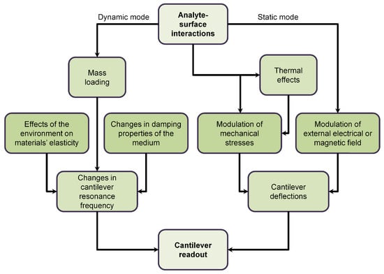 A flowchart describing the modes of operation and the principle of transduction for the microcantilevers. Adapted from the work in [80].