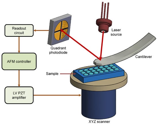 - Fukuma, T. Wideband low-noise optical beam deflection sensor with photothermal excitation for liquid-environment atomic force microscopy. Rev. Sci. Instrum. 2009, 80, 023707. [Google Scholar] [CrossRef] [PubMed]