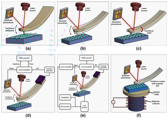 The AFM working modes: (a) contact mode, (b) tapping/dynamic mode, (c) frictional force microscopy, (d) phase mode, (e) Kelvin probe force microscopy, and (f) magnetic force microscopy.