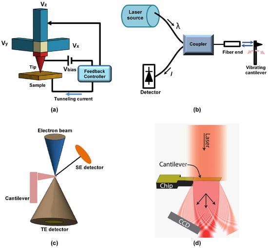 Interferometric displacement detection (see Figure 5b) is another method for measuring the displacement of a micro-cantilever [134,135,136] with sub-nanometer accuracy and with high resolution, but it is bulky and expensive. In fiber-optic interferometry, the optical interference in the micro-sized cavity between the cantilever and the properly cleaved edge of a single-mode optical fiber is used to detect small cantilever deflections. It is based on guiding the light entirely through an optical fiber and using a beam splitter to route light beams while the cleaved end and the reflective surface of the cantilever act as mirrors to produce the interfering patterns. The rationale behind this concept is that light is always delivered and collected through the same aperture that is several micrometers in diameter [137]. The high sensitivity and precision of a correctly calibrated displacement measurement makes optical interferometry a suitable method for measuring the small displacements of a cantilever. However, using optical fibers may induce additional imaging errors due to thermal drifts when the imaging duration is long in addition to special handling of the equipment to prevent stress during the positioning procedure [138].